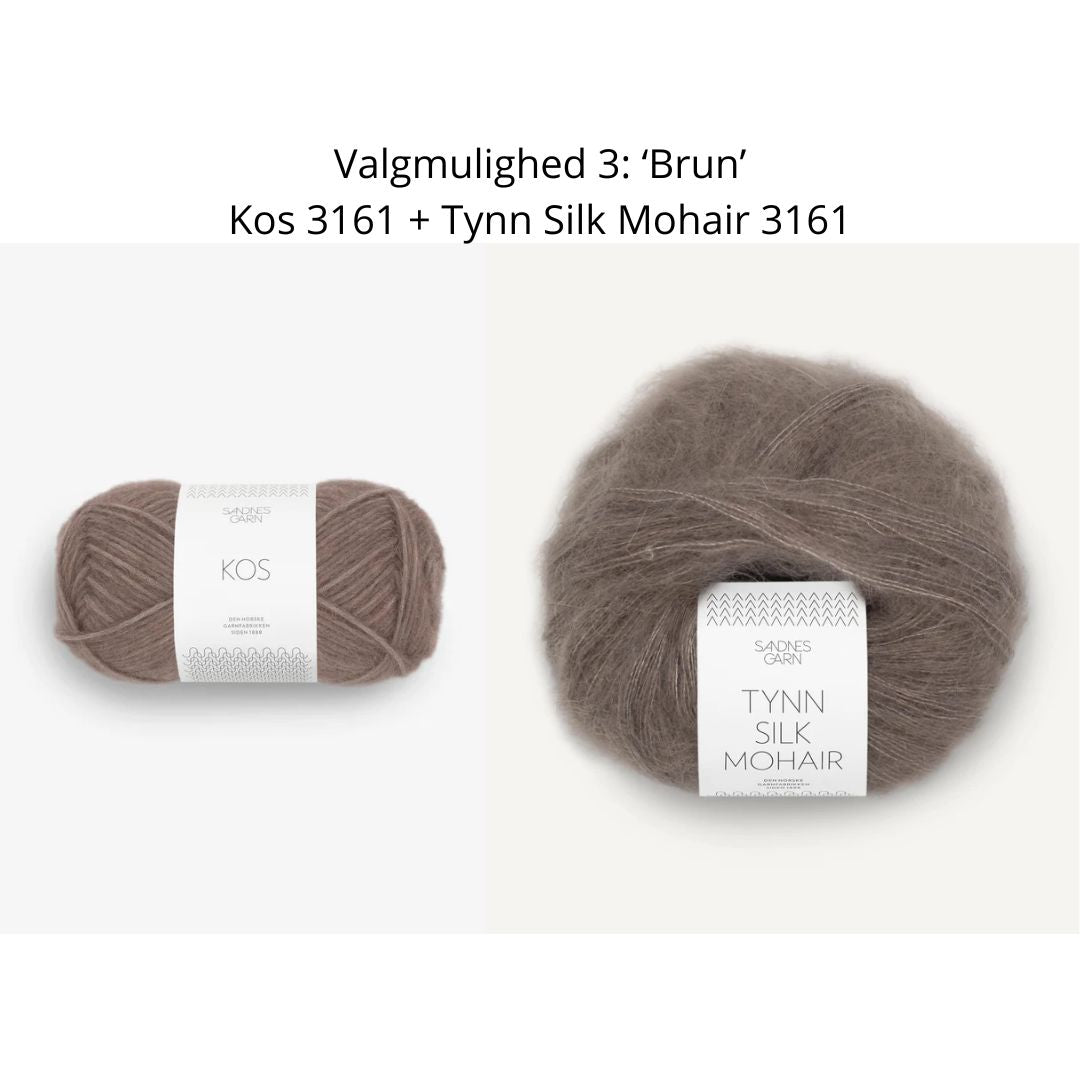 Materialer: 250 (250) 300 (300) 350 (350) 350 (400) 450 (450) g Kos fra Sandnes Garn (50 g = 150 m) strikkes sammen med 75-100 (100) 100 (100-125) 125 (125) 125 (150) 150 (175) g Tynn Silk Mohair fra Sandnes Garn (25 g = 212 m) eller Tilia fra Filcolana (25 g = 210 m)
