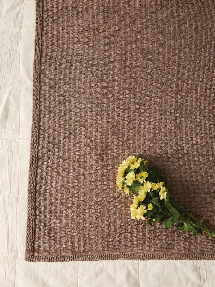Teppet strikkes frem og tilbake med rillekanter, de øvrige maskene strikkes med mønster etter diagram.