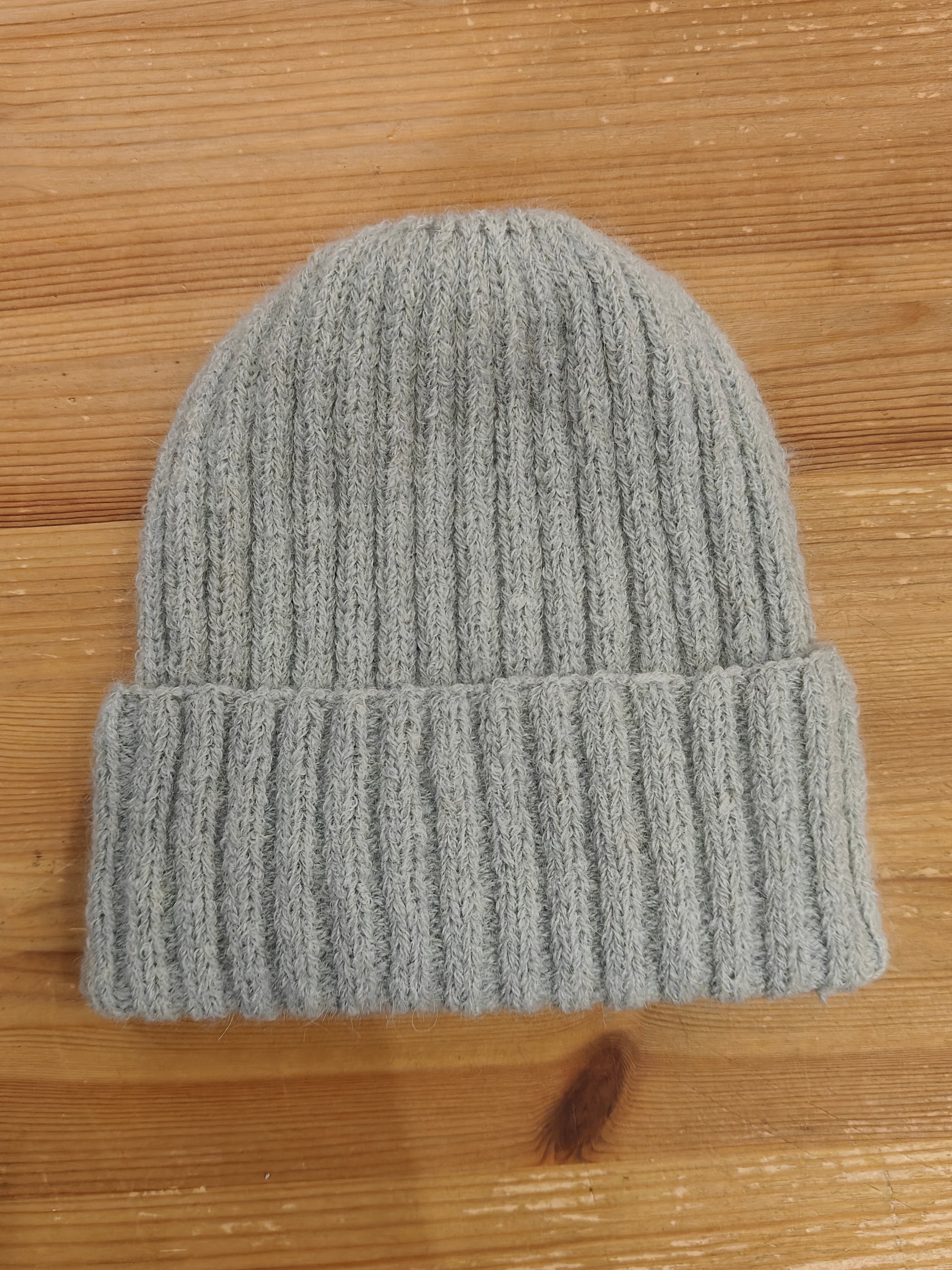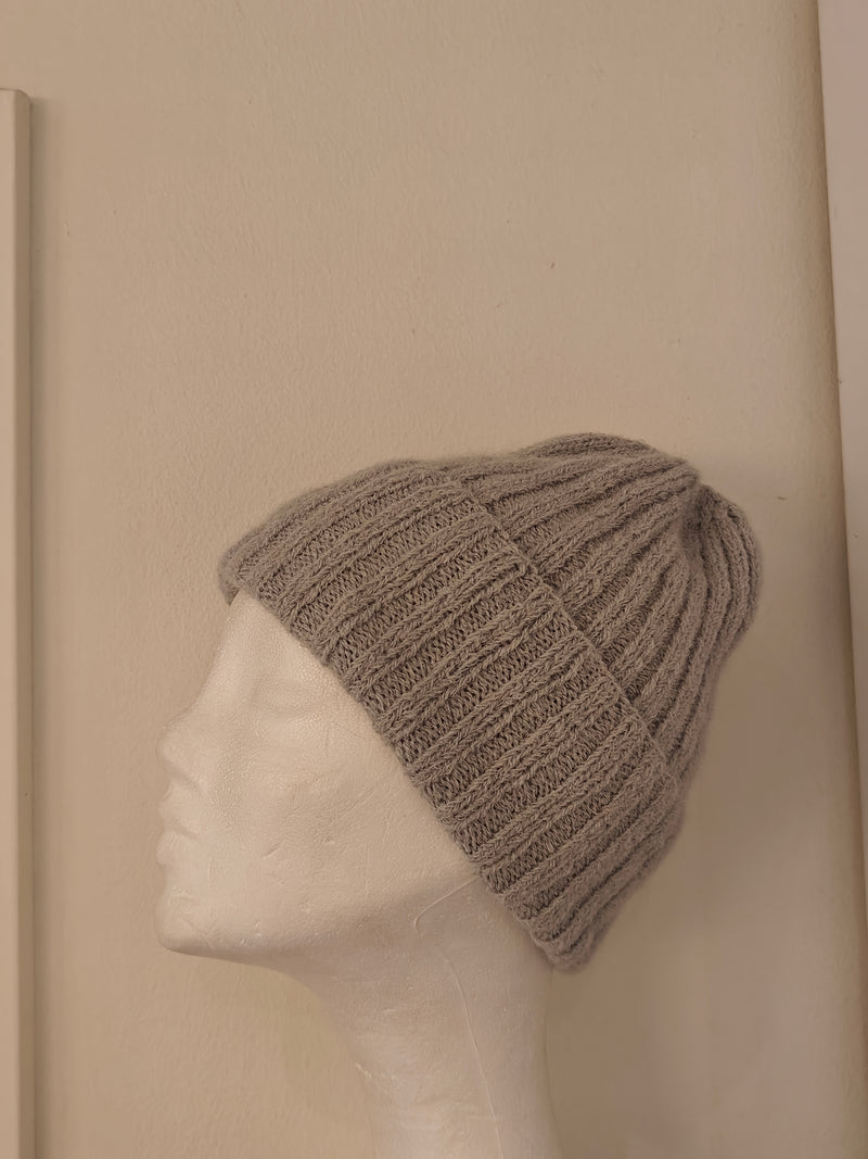 Slå 116-128 m op på rundp. 5 strik rib 2 vr 2 r til arb. måler ca. 27 cm. strik alle vrang sammen.. strik 2 omg. strik alle ret sammen. strik 2 omg. strik 2 ret sammen hele omg. strik 2 omg. strik 2 ret sammen hele omg. træk tråden igennem alle masker og træk sm.